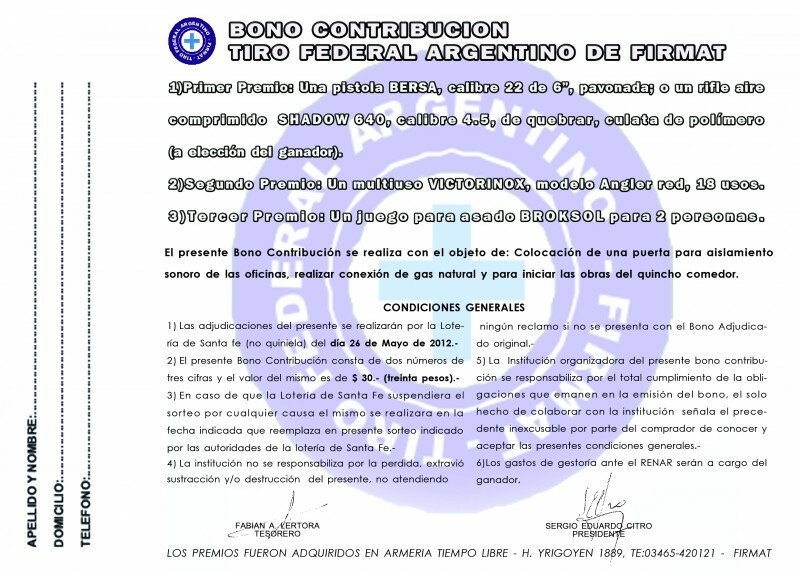 La institución deportiva más antigua de la ciudad lanzó un bono contribución. Los fondos recaudados serán destinados a diversas obras en el predio.Esta semana, la comisión directiva del Tiro Federal Argentino puso a la venta un bono contribución cuyo valor asciende a los 30 pesos.